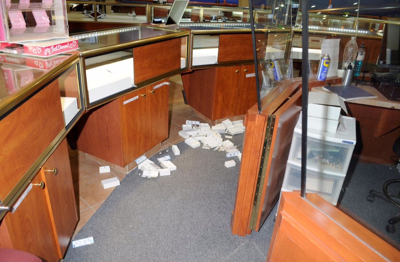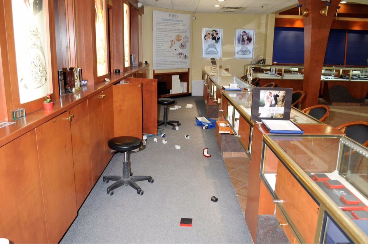 Police say multiple suspects allegedly broke into separate, adjacent businesses before getting into the jewellery store.