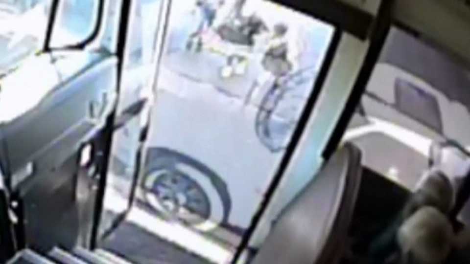WATCH ABOVE: A group of school kids were nearly run down by a speeding SUV as they boarded their school bus – and the terrifying incident was caught on camera. Elisa Hahn reports.