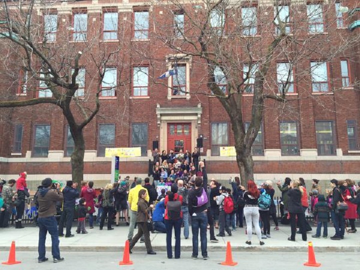 Québec solidaire MNA Françoise David took part in the event at Saint-Jean-de-Brébeuf School, where a human chain was formed around the school to protest underfunding.