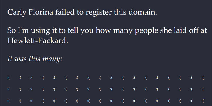 “Carly Fiorina failed to register this domain. So I’m using it to tell you how many people she laid off at Hewlett-Packard. It was this many,” reads a message on the site.
