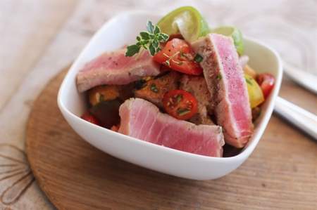 I like to toss a gorgeous hunk of tuna on the grill. The flavour even can rival the satisfaction of a juicy steak (and I am a self-professed meat lover). And once it comes off the grill, I like to turn it into my version of an Italian panzanella (bread) salad. I toss the tuna with some grilled summer veggies and bread off the grill, then serve it on a colorful heirloom tomato salad.
