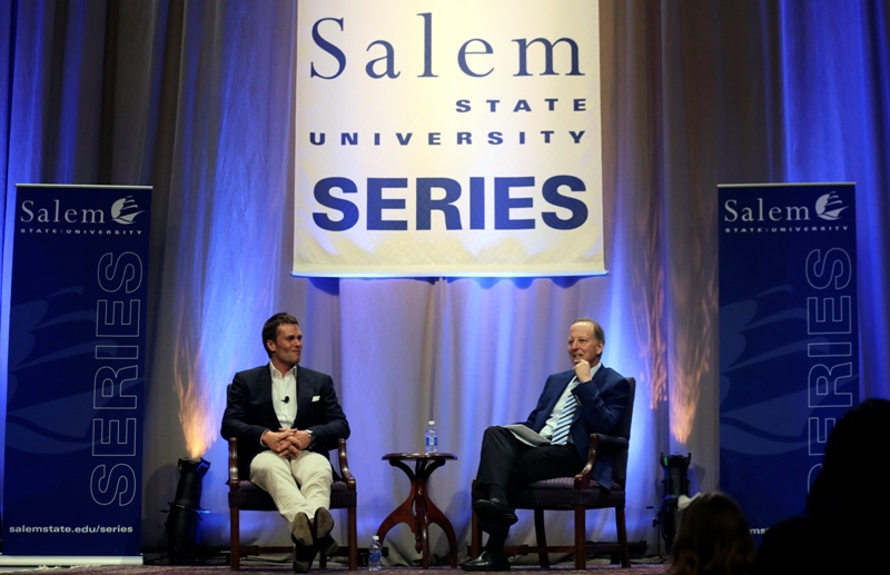 The superstar quarterback spoke at a Q&A session moderated by sportscaster Jim Gray during a previously scheduled, sold-out event at Salem State University. He arrived by helicopter for the talk on leadership, avoiding a long line of fans outside and media waiting for him to enter. The event was delayed more than 30 minutes to allow fans to file in, including some wearing Brady jerseys. During the wait, the crowd chanted “Brady” and “MVP,” then gave him a standing ovation as he walked in.