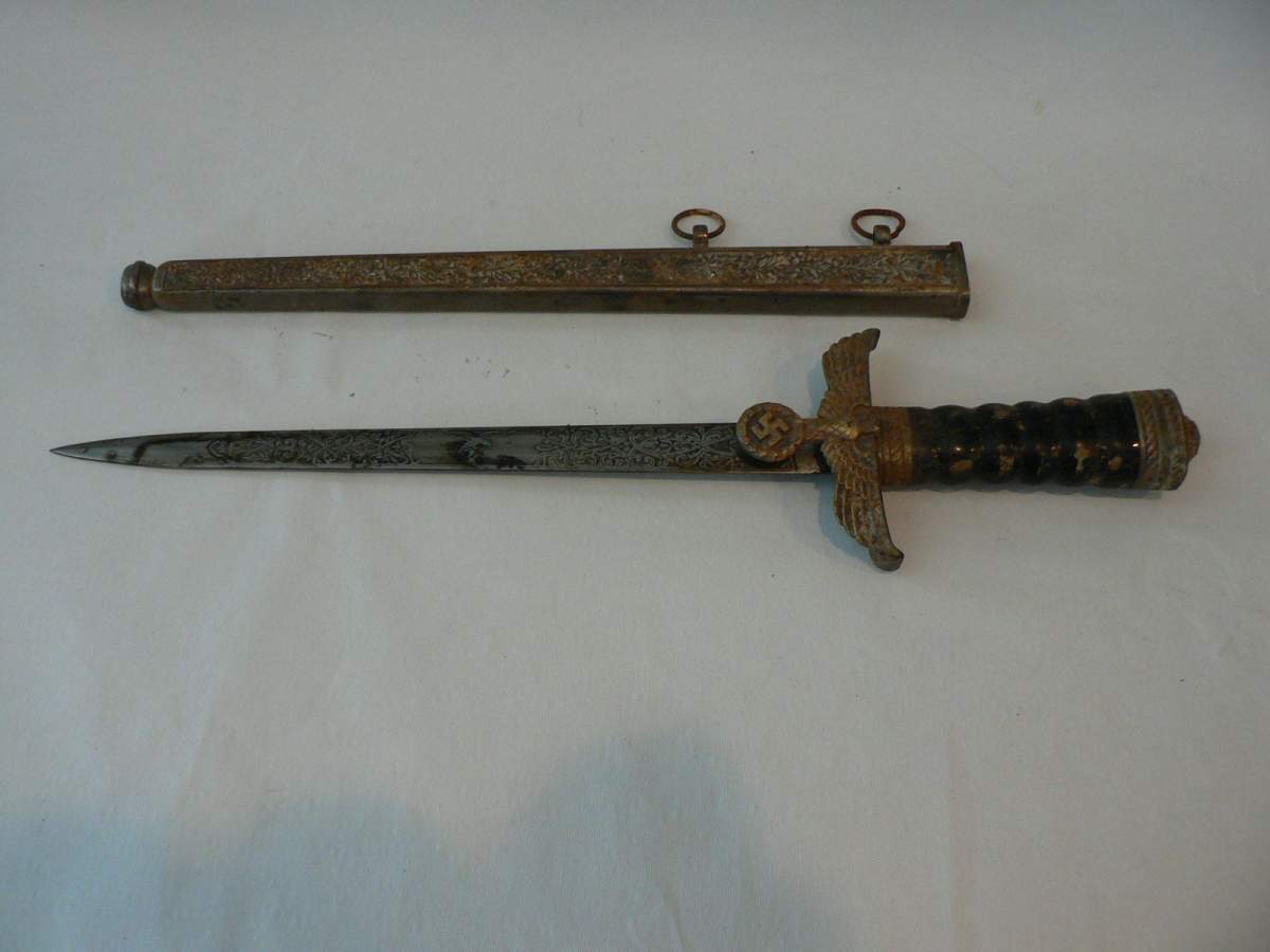 Nazi medals, badges, pins, a statue of an eagle and swastika, a Luftwaffe dress dagger, a Rad dagger and a parade bayonet were taken.