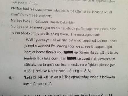 Police were tipped off to the Facebook comments by Norton’s concerned sister in Calgary who told investigators she believes he is capable of carrying out his threats.