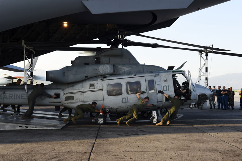 U.S. Army Col. Steve Warren said an Indian helicopter in the air nearby at the time heard radio chatter from the Marine aircraft about a possible fuel problem. He said the Huey, carrying tarps and rice, had dropped off supplies in one location and was en route to a second site when contact was lost. He said officials are hopeful that the aircraft is simply missing because there has been no smoke or other signs of a crash.