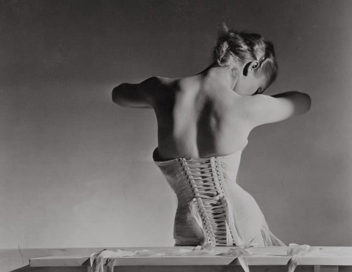 Almost as a reminder that photographic manipulation was used before the advent of Photoshop, the photo is featured in the exhibition twice: the original, slightly unbound version and is next to the retouched version Vogue published, where the corset is more tightly wrapped.