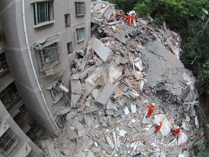 The collapse occurred at about 11:30 a.m. in Guiyang city, leaving a pile of steel, bricks and other rubble. By early evening, the city government said 98 residents had been found safe. It was still trying to contact 16 others, and cellphone signals of 15 of them had been traced to the site.