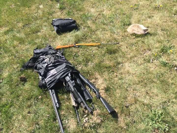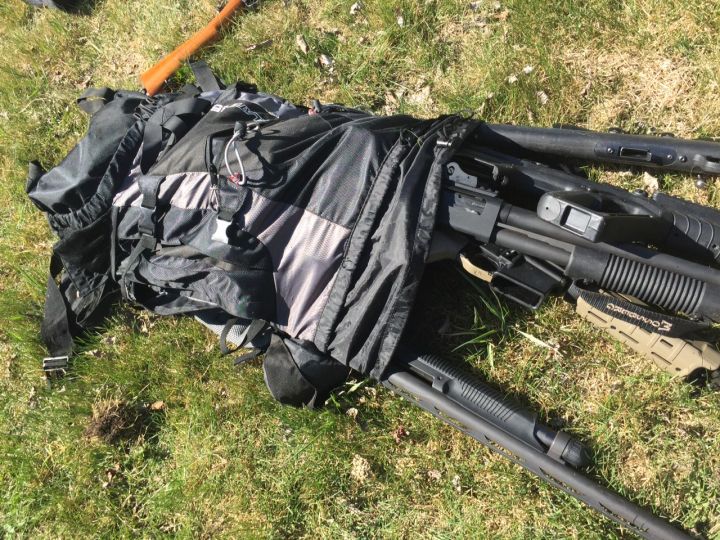 Police were told that a man illegally entered a nearby home and left with a backpack containing several firearms.