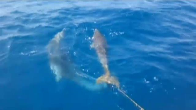ABOVE: Cellphone footage captures the moment three fishermen attempt to free a baby dolphin tangled in a rope while it’s mother looks on