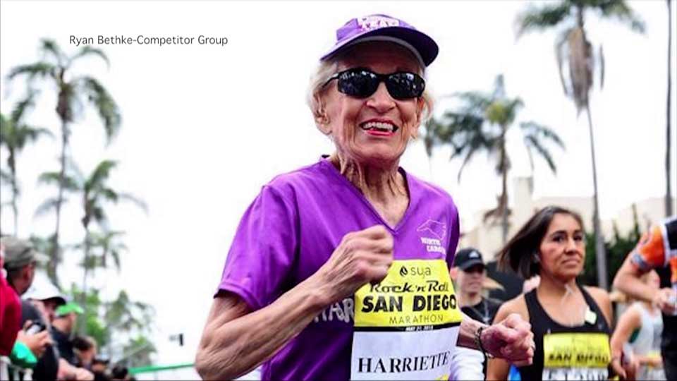 SAN DIEGO – A 92-year-old cancer survivor rocked her way into the record books on Sunday, becoming the oldest woman to finish a marathon.