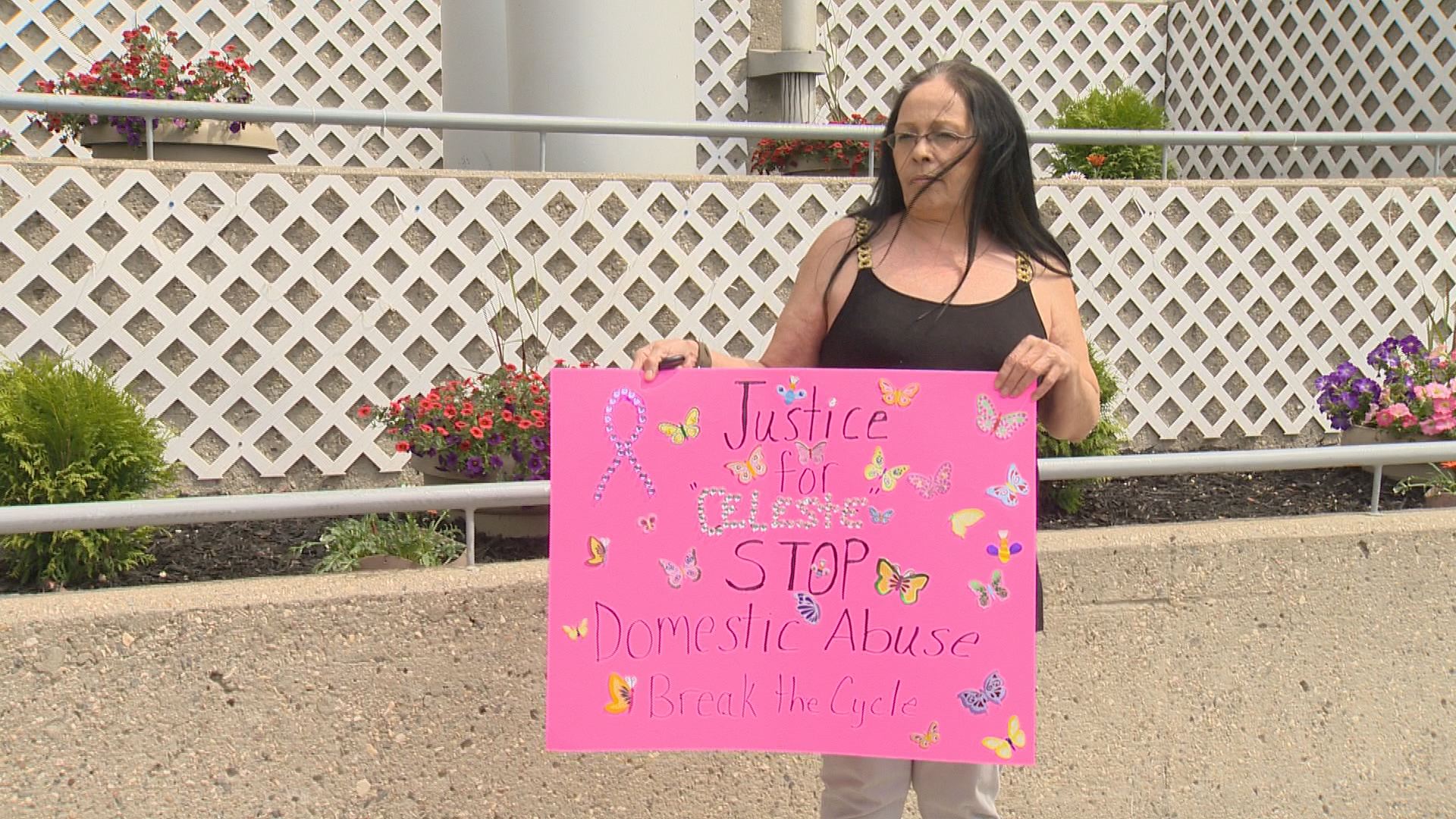 She held a sign outside the courthouse that read, “Justice for Celeste. Stop Domestic Abuse. Break the Cycle.”