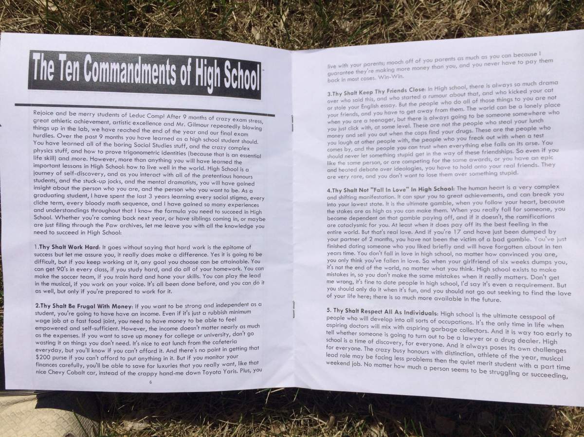 Written by a male Grade 12 student at Leduc Composite High School, parts of the “10 Commandments of High School” article read: