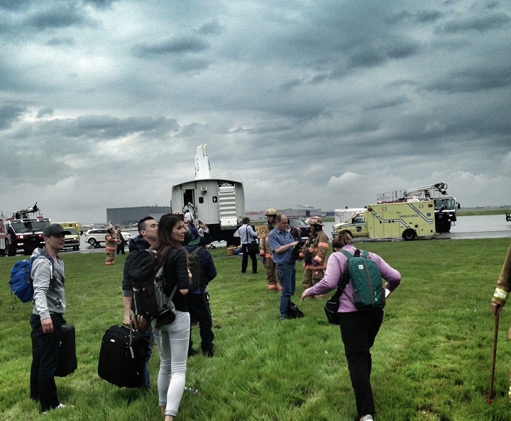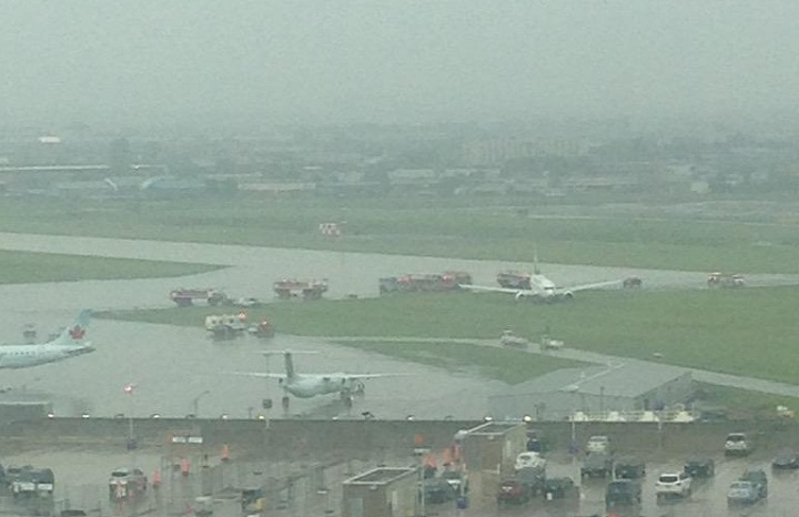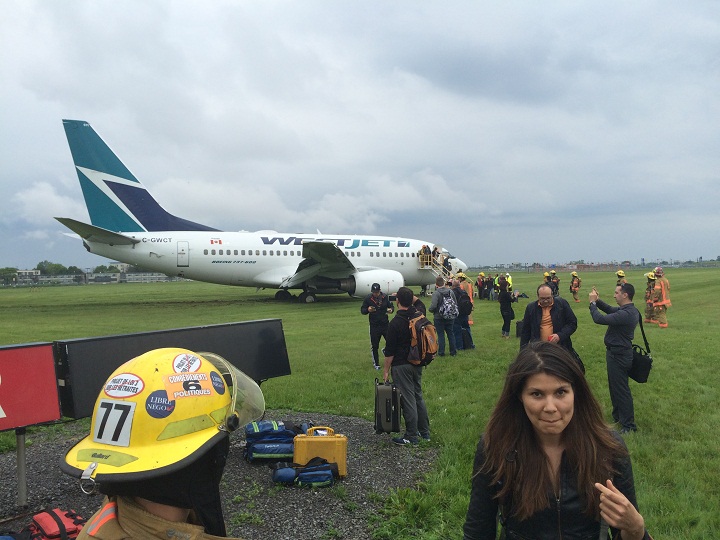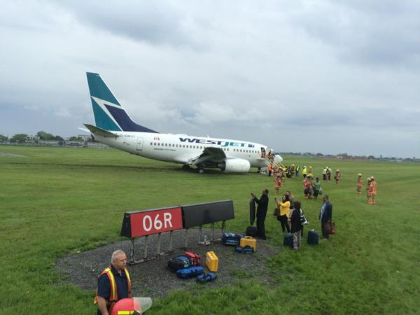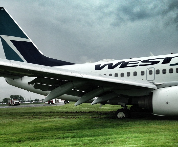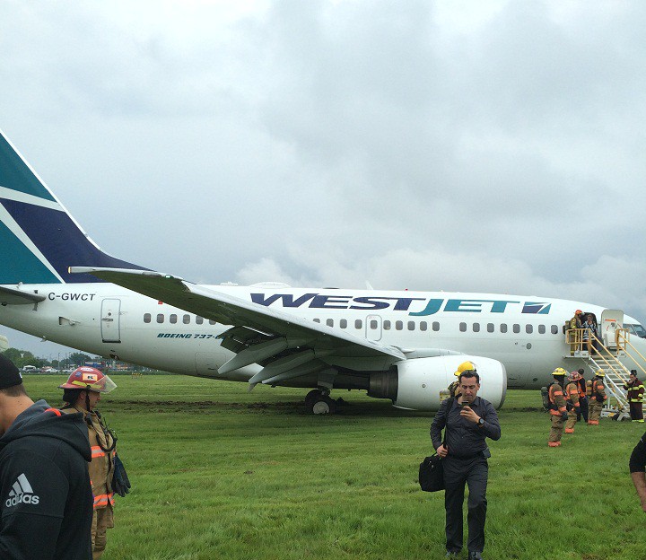 Richard Bartrem, a spokesperson for the airline, told Global News there was no visible damage to the aircraft after the plane skidded off the end of the runway and came to a stop on the grass.