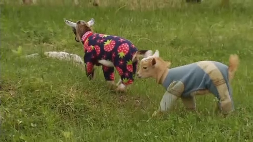 A video posted by Sunflower Farm Creamery in Maine shows three-week-old Nigerian dwarf goats siblings Winifred and Monty leaping, prancing and chasing each other around a barn on a rainy day, dressed in fleece pajamas.