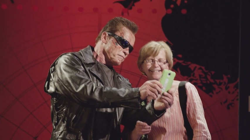 Several more visitors passing through the museum get frightened off as Schwarzenegger offers to help them with their cameras or warns them not to touch.
