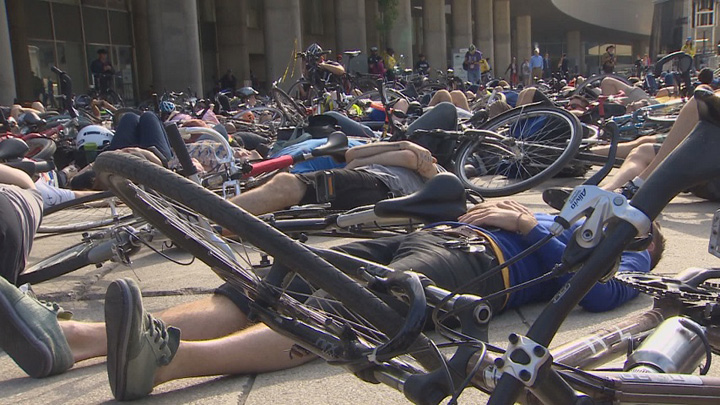 The protest was organized by Cycle Toronto, which prompted supporters to lay motionless next to their bikes at 8:30 a.m. to send a message to City Hall that more needs to be done to keep the city’s streets safe for cyclists.