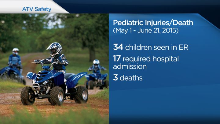 Alberta’s two pediatric emergency departments have treated 34 children for ATV-related injuries since May 1. Seventeen of those children had injuries so severe they had to be hospitalized. Last year, between April 1, 2014 and March 31, 2015, 318 kids under 16 were injured on ATVs, 40 of whom had to be hospitalized. Two died of their injuries.