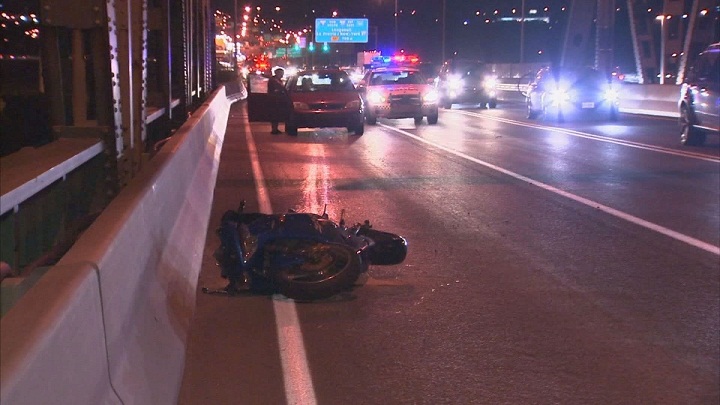 MONTREAL – A motorcyclist is dead after hitting a concrete wall and plummeting off the Champlain bridge.