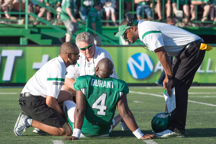 Durant was seen leaving Mosaic Stadium on crutches midway through the fourth quarter with a protective boot on his left foot. The team later announced that he suffered a ruptured Achilles tendon and will miss the rest of the season.