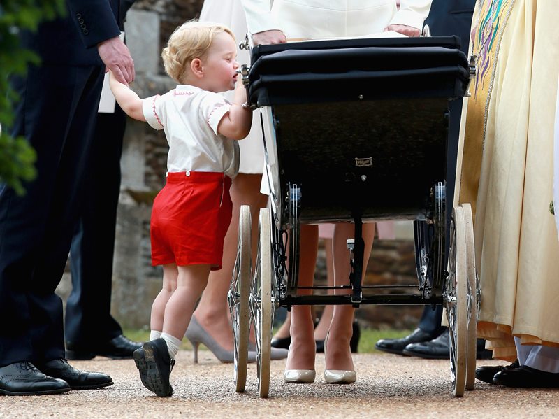 The one-year-old wore an outfit almost identical to the one his father wore when he first met Prince Harry at St. Mary’s Hospital in 1984. He also peered into the vintage stroller to get a glimpse of his sister in her christening gown.