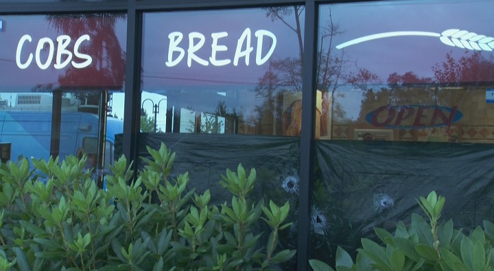 Officers were called to the 18800-block of Fraser Highway just after 2:00 a.m. Police didn’t find any victims or suspects, but discovered bullet holes in the window of COBS Bread. Shell casings were also found at the scene.