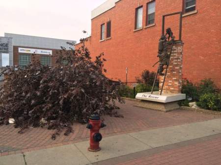The base of The Rescue statue, which depicts a firefighter saving a young girl from a fire, was defaced by black marker.