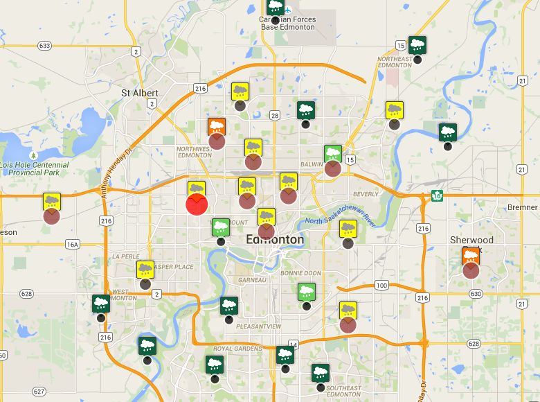 The map has display icons that will change colour and size to visually depict the severity and amount of rainfall in the Edmonton area.