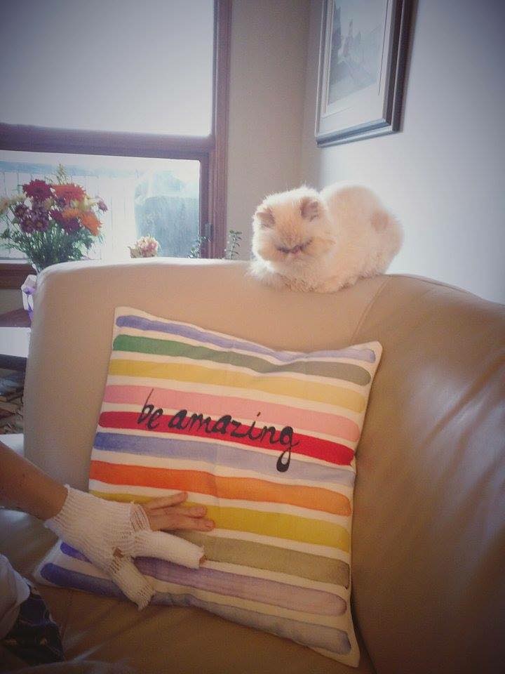 I look forward also to sharing with you through social media how I am recovering. I want to share photographs of the beautiful gestures and gifts that I received. This will help me get back to all of you and to stay connected with all my dear friends and well-wishers. The photo attached to this message shows the pillow that my friend Michelle brought me to the hospital the day after the explosion. The message is clear: We all have the opportunity to be amazing to each other so let’s keep doing that. My cat Figaro has not left my side since I’ve been home – I think he is guarding me. smile emoticon I am truly surrounded by love.