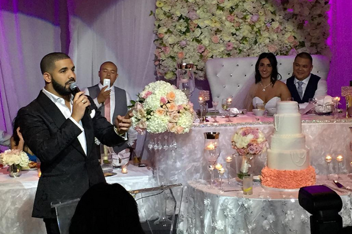 Drake, who arrived back in his hometown earlier in the week on a private jet from London, thrilled the newlyweds and their guests.