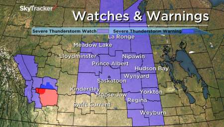 SASKATOON – A portion of west-central Saskatchewan is under a severe thunderstorm warning. Environment Canada officials say conditions are favourable for dangerous thunderstorms to develop Wednesday afternoon and into the evening.