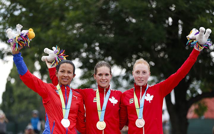 Glaesser won gold in the women’s road race Saturday, sprinting away from the pack to win the women’s road race in two hours 17 minutes seven seconds, finishing by half a wheel ahead of Cuba’s Marlies Mejias. Canada’s Allison Beveridge took bronze, 34 seconds behind Glaesser.