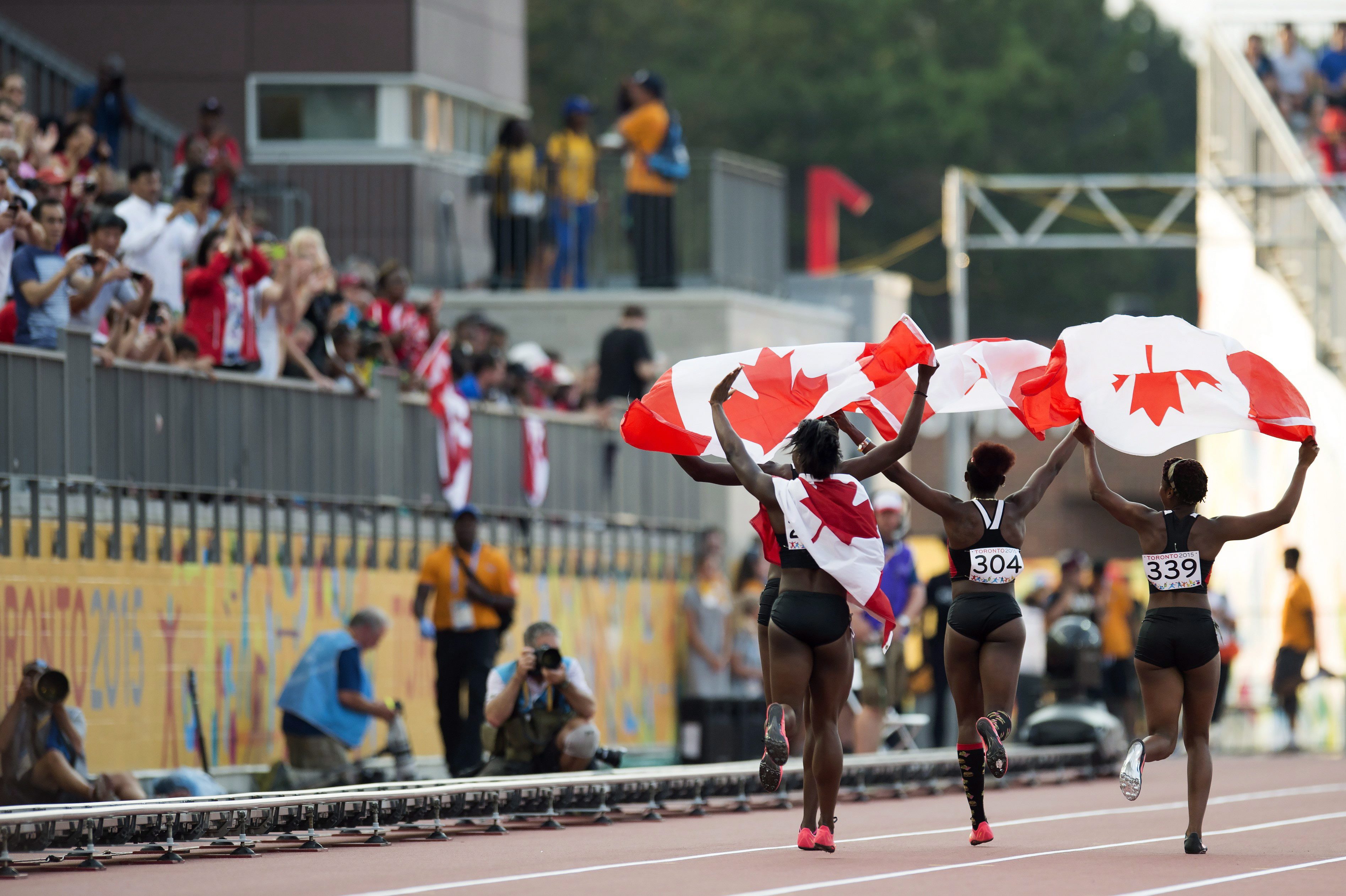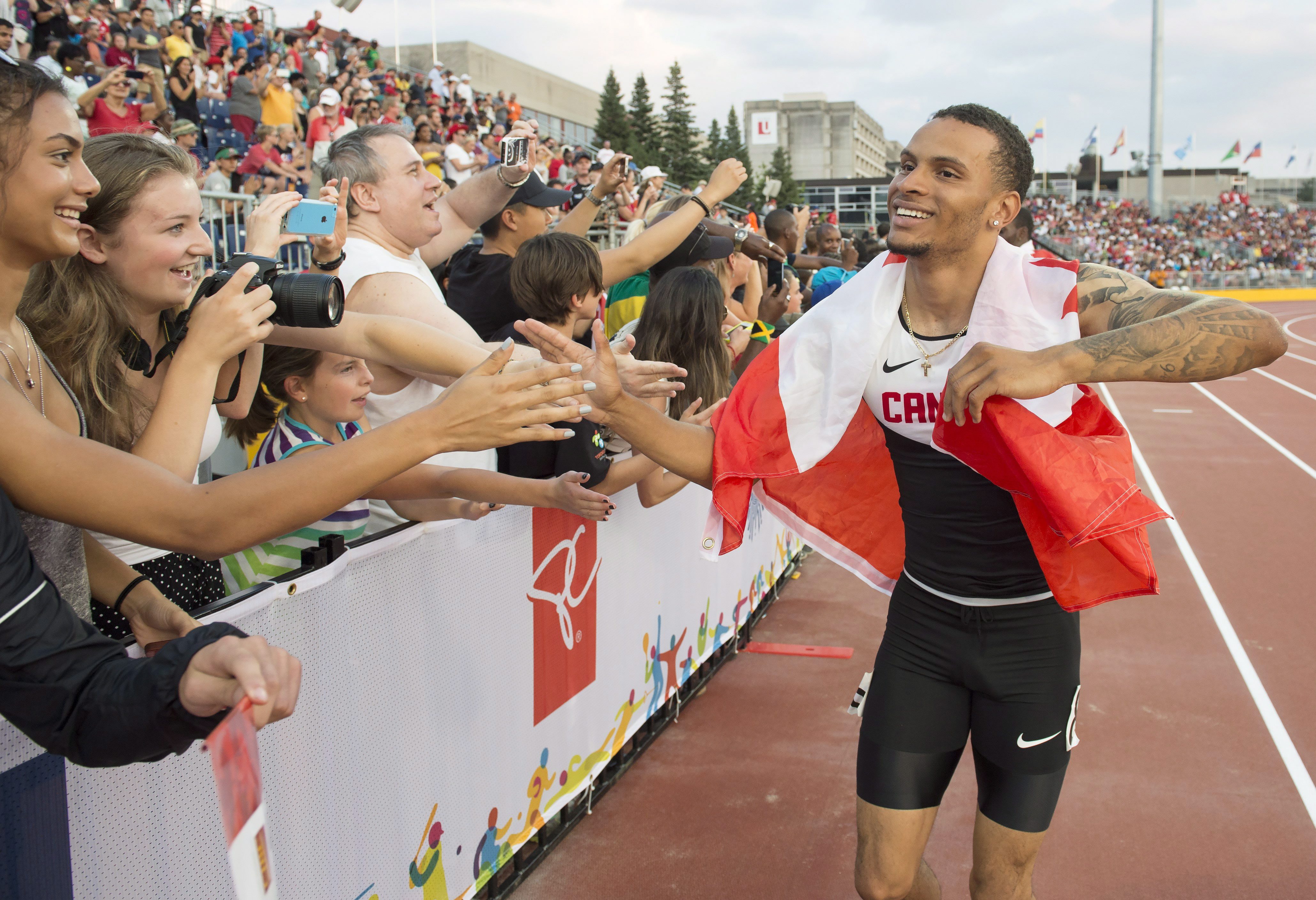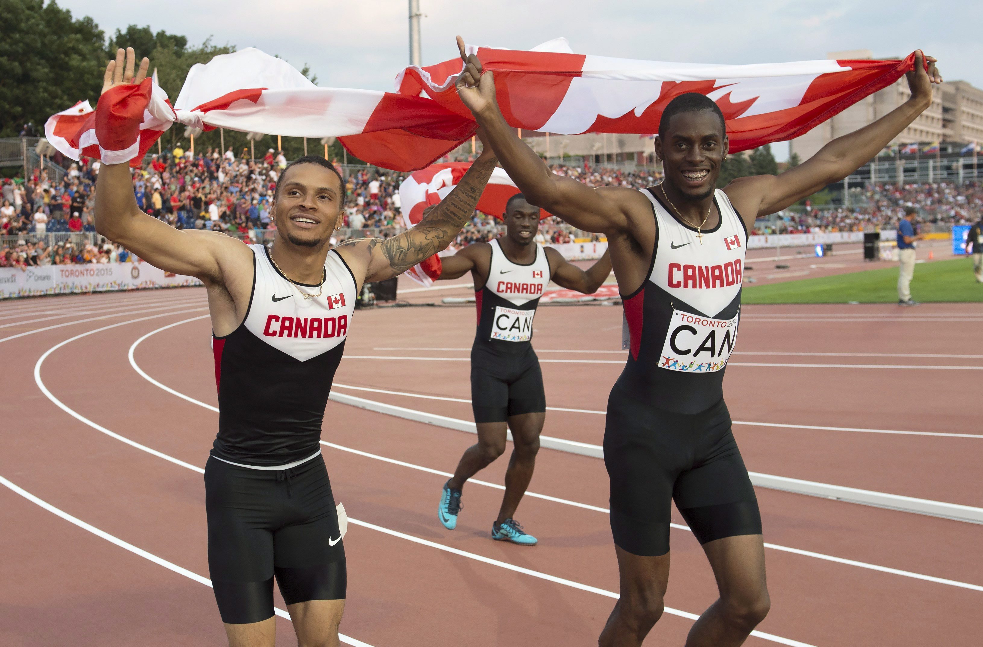 On the track, Gavin Smellie, De Grasse, Brendon Rodney and Aaron Brown appeared to have won the gold medal in the 4×100-metre relay when they crossed the finish line in a Pan Am Games record time of 38.06 seconds.