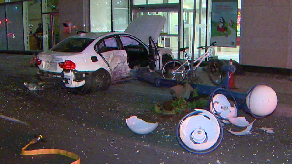 The two-vehicle collision took out a TTC shelter and caused damage to the exterior of a CIBC bank.