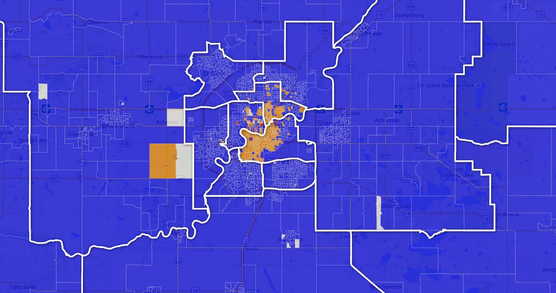 Edmonton, where the federal NDP already has a foothold in Edmonton-Strathcona, is much more fertile ground for the party. Even in a simulation of Alberta’s provincial election in which Wildrose and PC votes are combined, all nine Edmonton ridings light up bright orange.