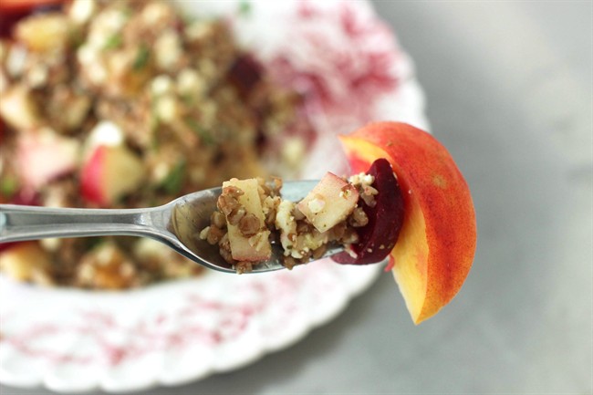 KASHA SALAD WITH BEETS, STONE FRUIT, WALNUTS AND MINT