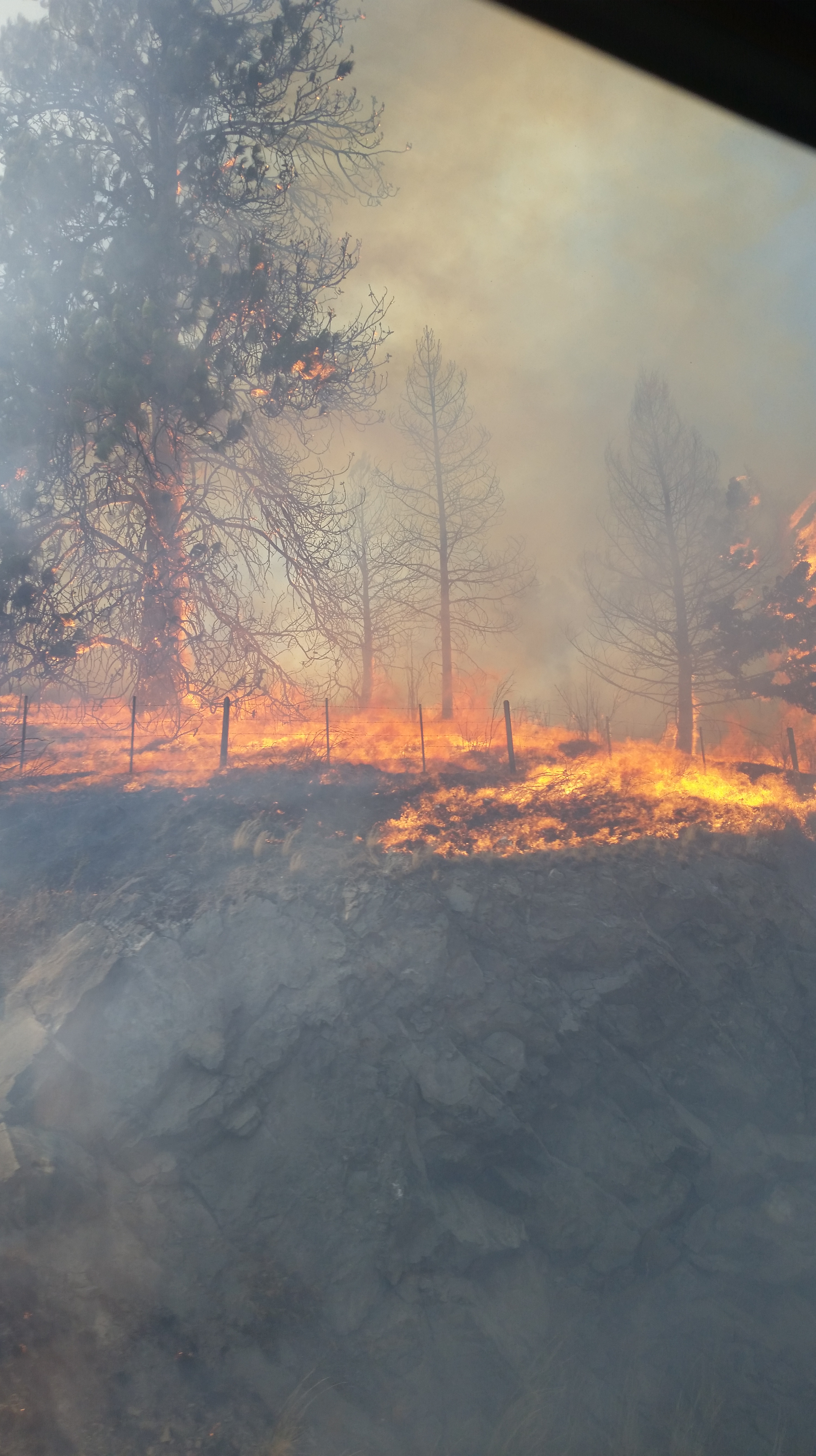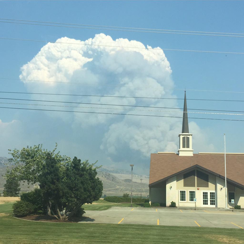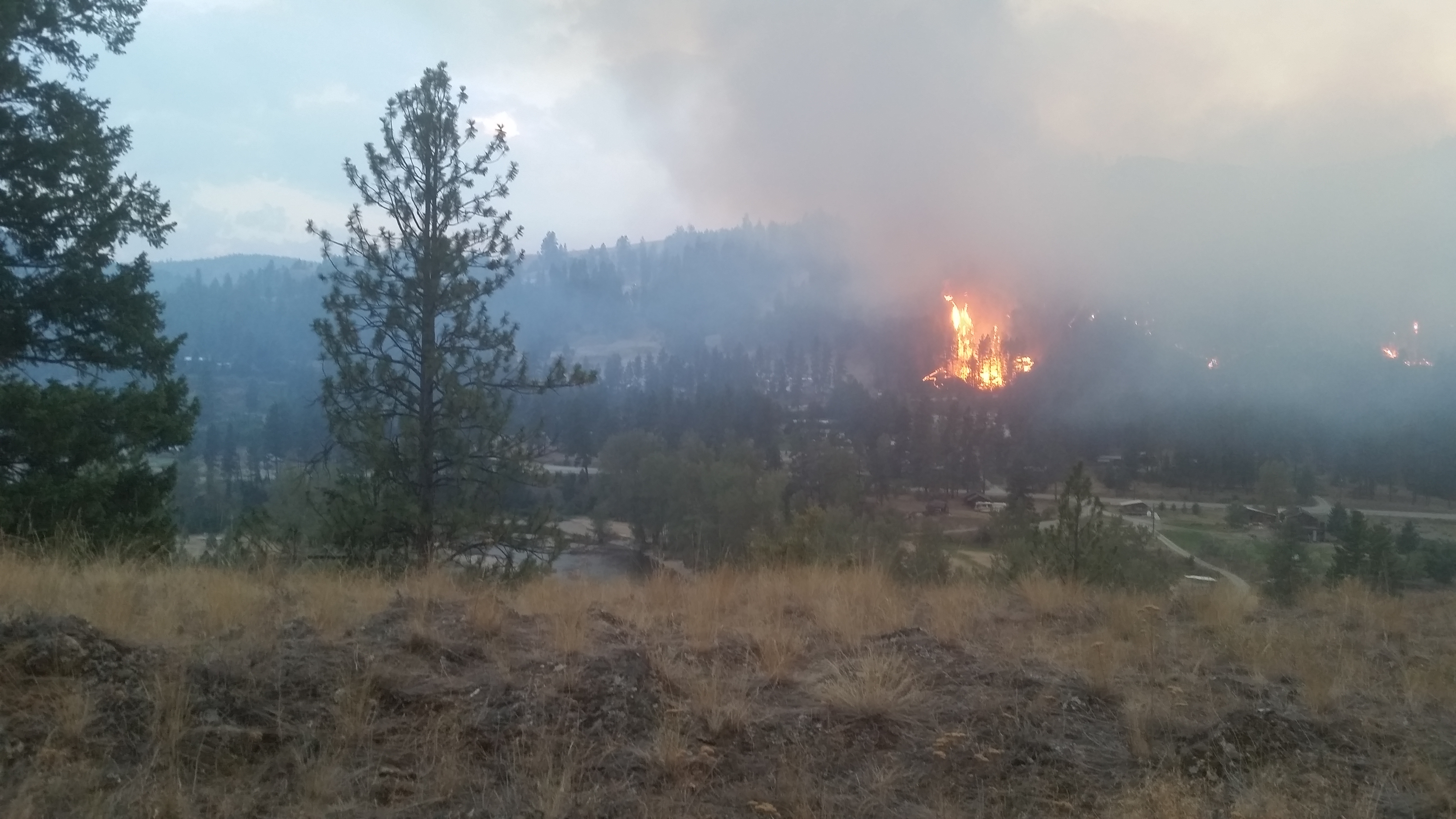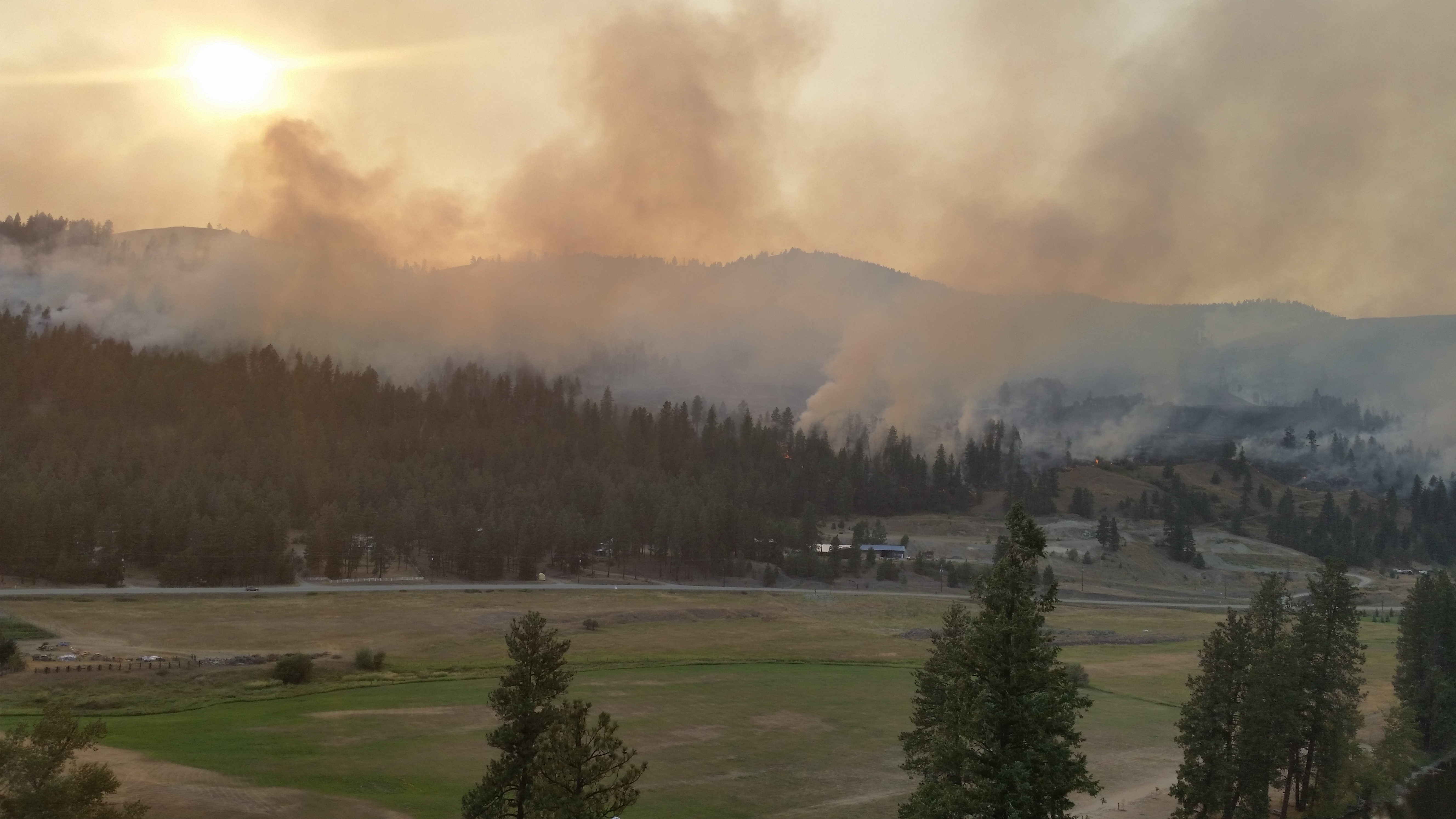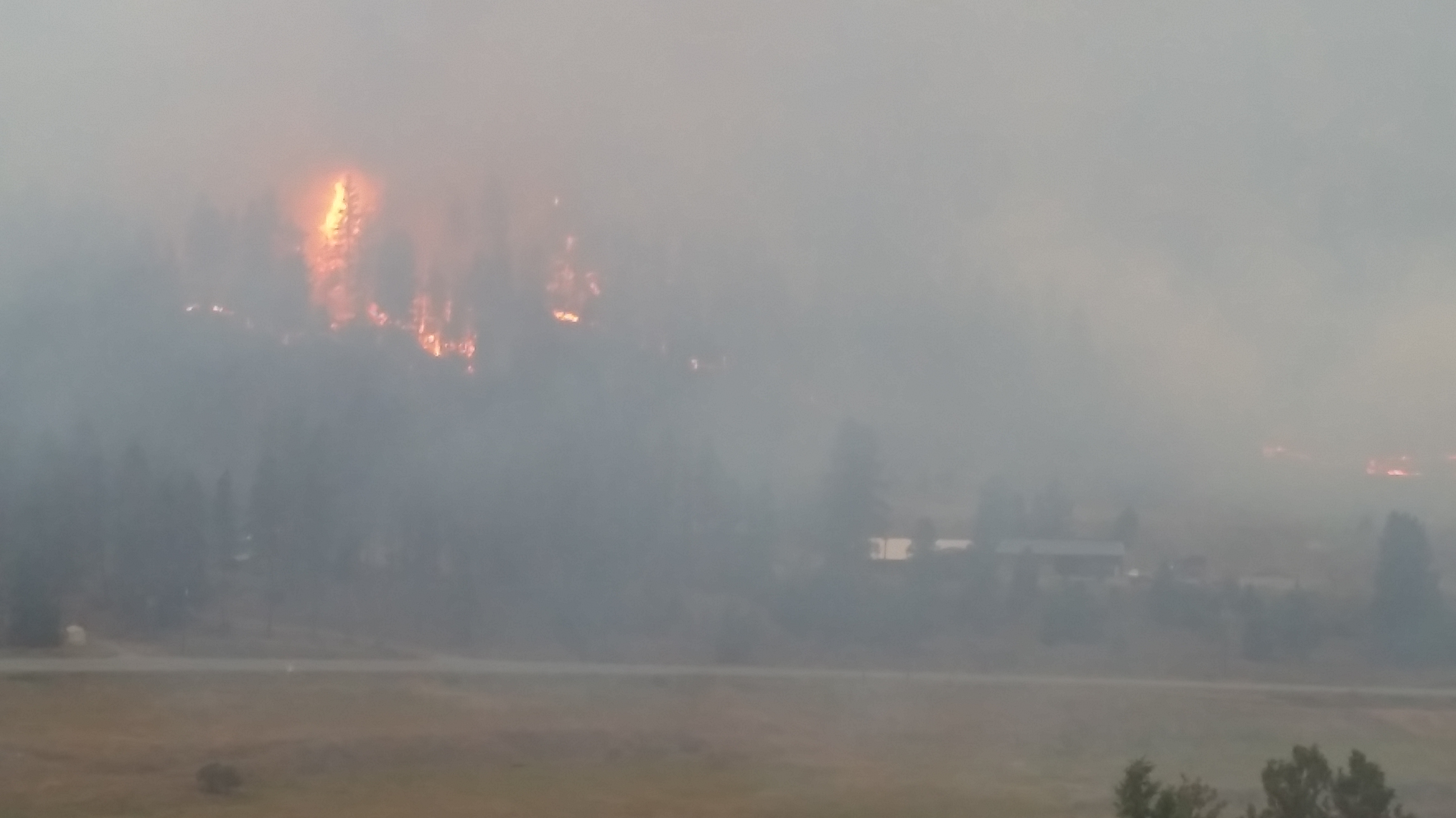 The fire is within metres of Highway 33, and massive plumes of smoke can be seen from as far away as Midway.