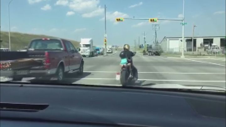 CALGARY – A video of a small child riding on the back of a motorcycle in Calgary is raising questions about motor vehicle safety.