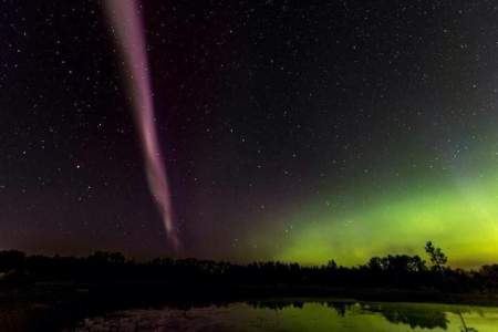 The Southwest Research Institute theorizes that the most common types of northern lights shine bright green in wide sheets and swirls fuelled by a wide spectrum of electromagnetic energy. The slender aurora arc from Sunday night had a rare vertical orientation.