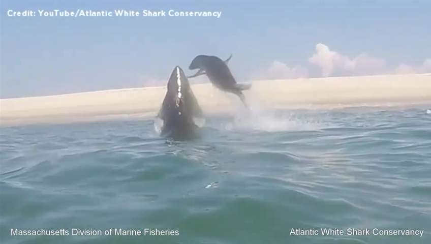 Dr. Greg Skomal with the Massachusetts Division of Marine Fisheries recorded the video while working with the Atlantic White Shark Conservancy near Monomy, Cape Cod.