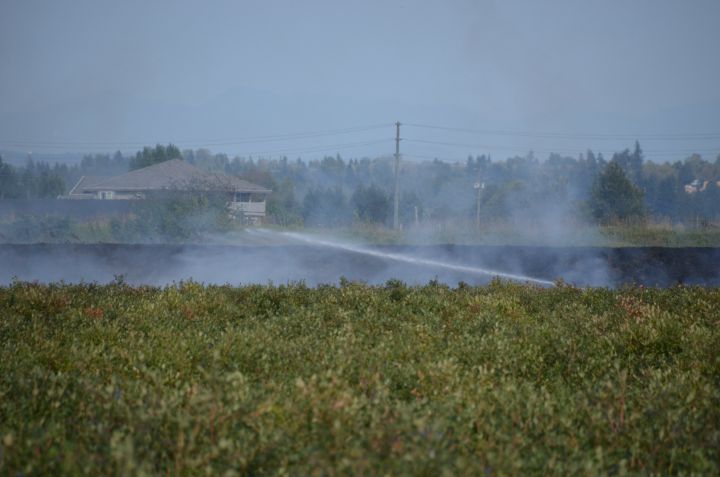 Nine fire trucks and 17 personnel battled the blaze in a blueberry field near the 15600-block of 48 Ave. along the Serpentine River.