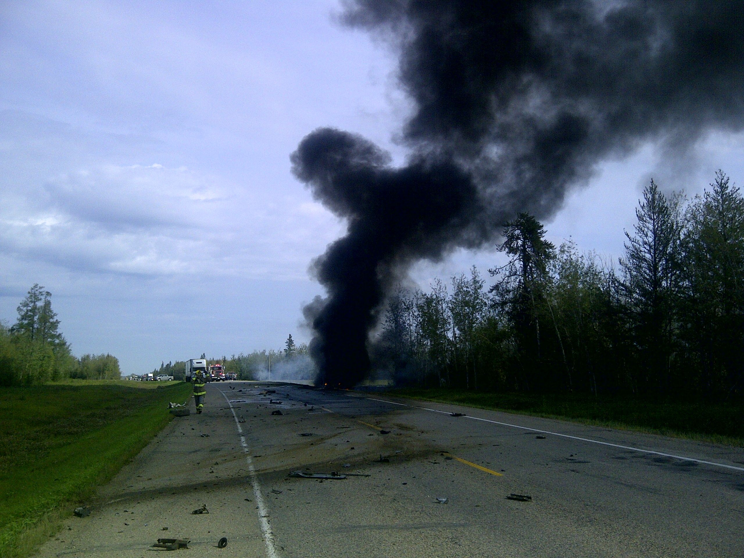 Highway 63 was closed in both directions at Township Road 670.5 for four-and-a-half hours. Traffic was detoured around the collision site while crews worked to put out the fire and remove the wreckage.