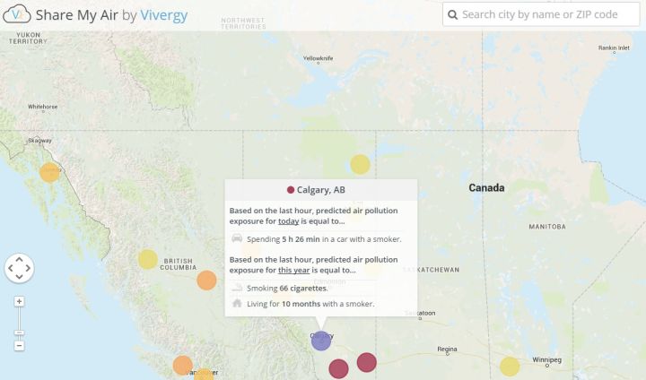 To use the tool, just go to the site, click on any city, and see how the air pollution rates. It will give information summaries based on the last 24 hours, the last month and the last six months. The data is updated hourly so ratings will change throughout the day. The web tool converts air pollution exposure in your city of choice to time spent in a car with a smoker, living with a smoker, or the number of equivalent cigarettes smoked.