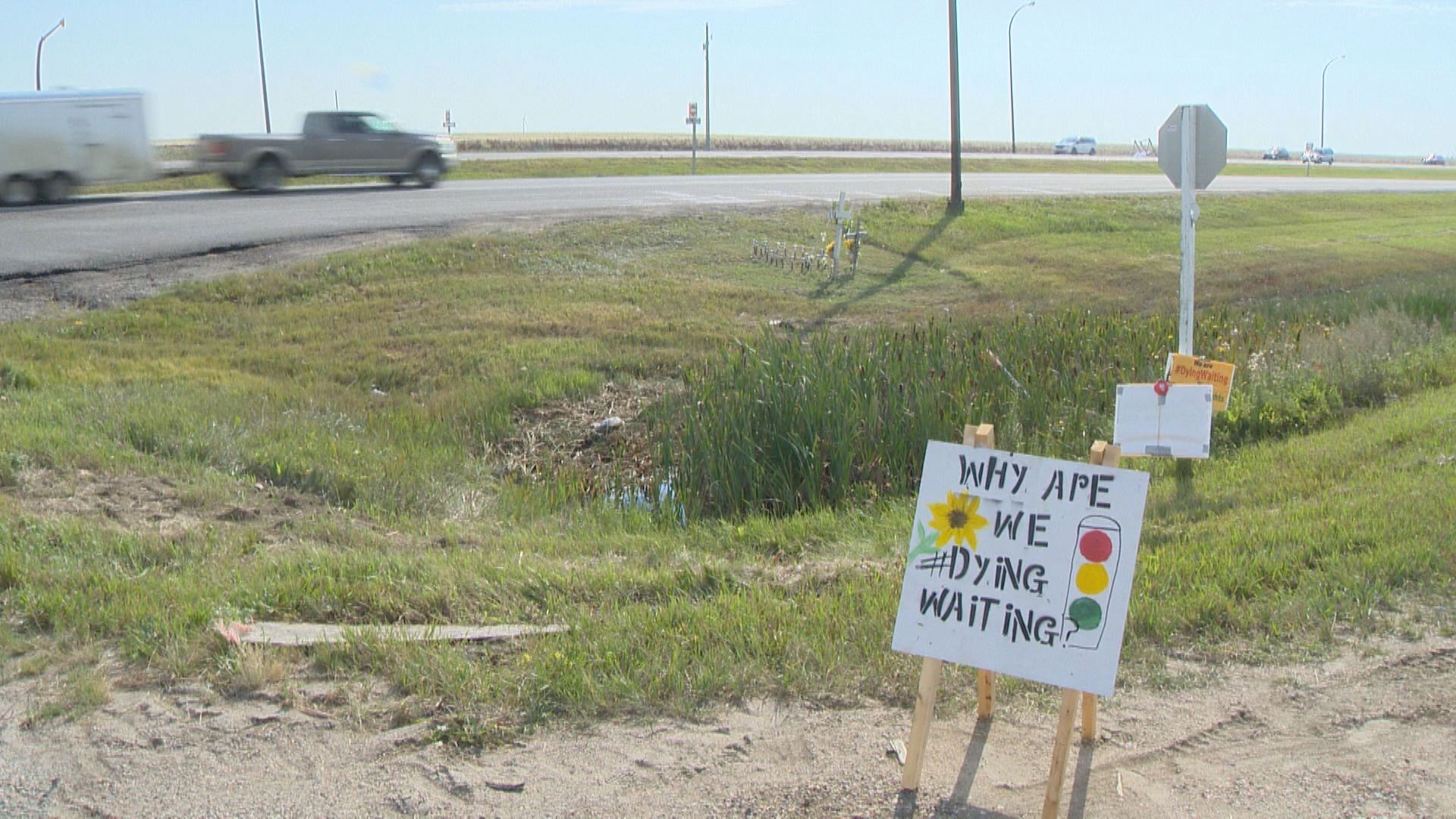 Campbell and the other members of the vigil are pushing the Ministry of Highways to install a stop light at the intersection. They’re doing this by circulating postcards of their “#DyingWaiting” campaign addressed to Minister of Highways Nancy Heppner.