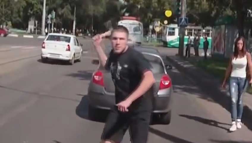 A viral dash cam video uploaded to YouTube by a motorist in Russia shows another man getting out of his car and charging with two weapons in an incredible road rage incident.