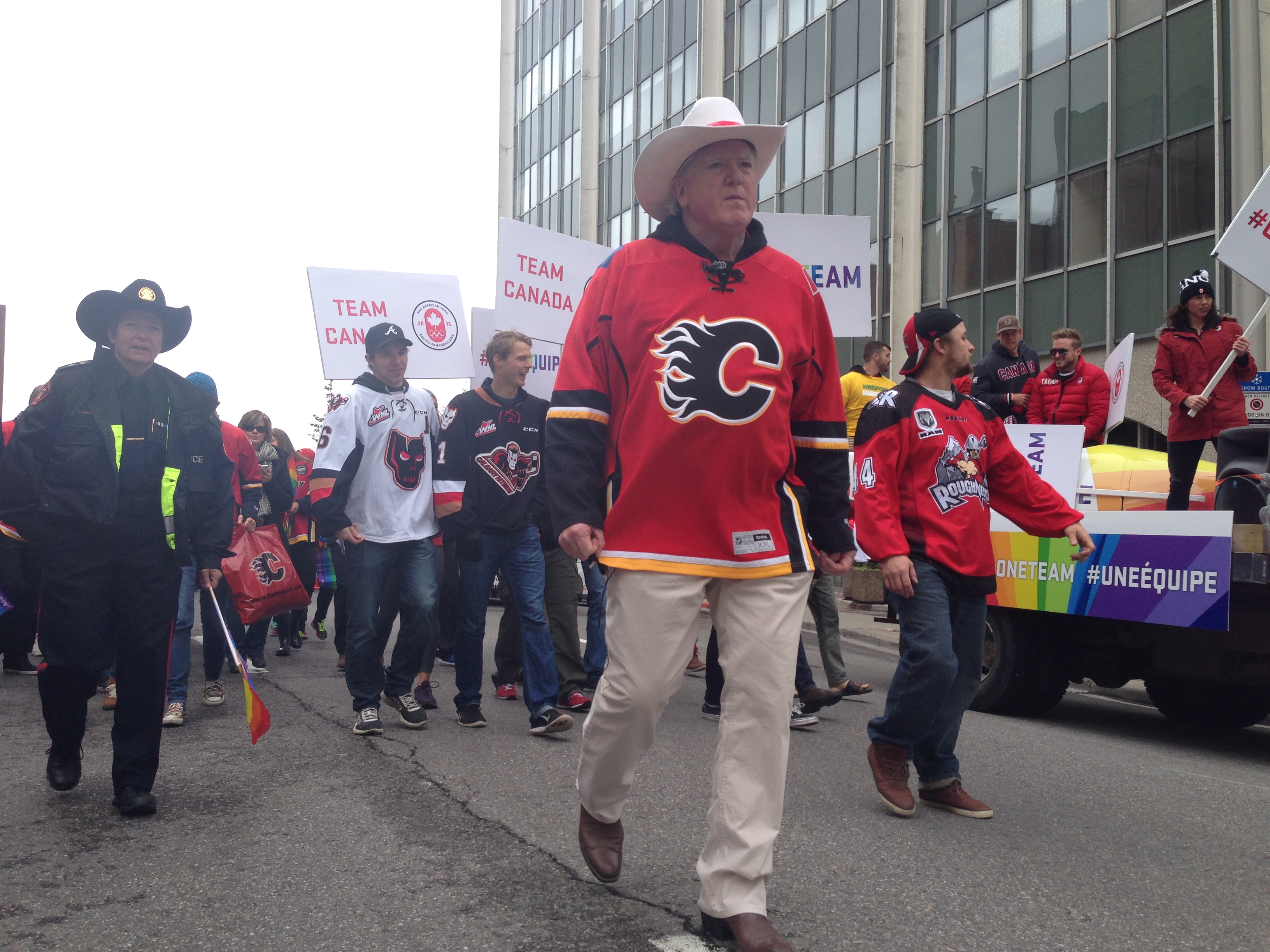 Marching alongside Burke, was Mayor Naheed Nenshi, PFLAG Calgary, Calgary Olympic Team, The Flames, Roughnecks and many more Calgary sports teams, businesses and leaders.