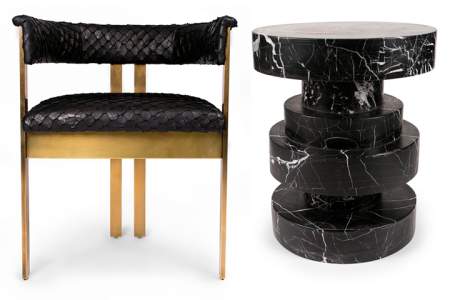 Kelly Wearstler’s Apollo stool is an artful stack of black or white marble circles; her Elliott chair is a sexy mix of curvy bronze and exotic fish leather; and her Array, District and Astral rugs bring Brutalist imagery to the floor.