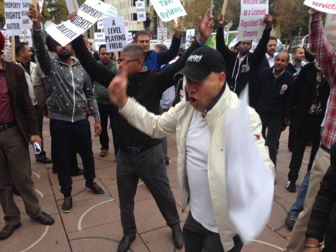 Traditional taxi drivers held signs reading “level playing field”, “enforce taxi bylaws” and “Unregulated, unsafe, unfair, unacceptable.”