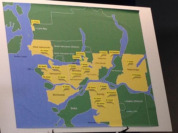 Chief Supt. Kevin Hackett of the B.C. Combined Forces Special Enforcement Unit says 15 victims with links to the Justice Institute of British Columbia were targets in 19 arsons and four firearms related incidents between April, 2011, and January, 2012.