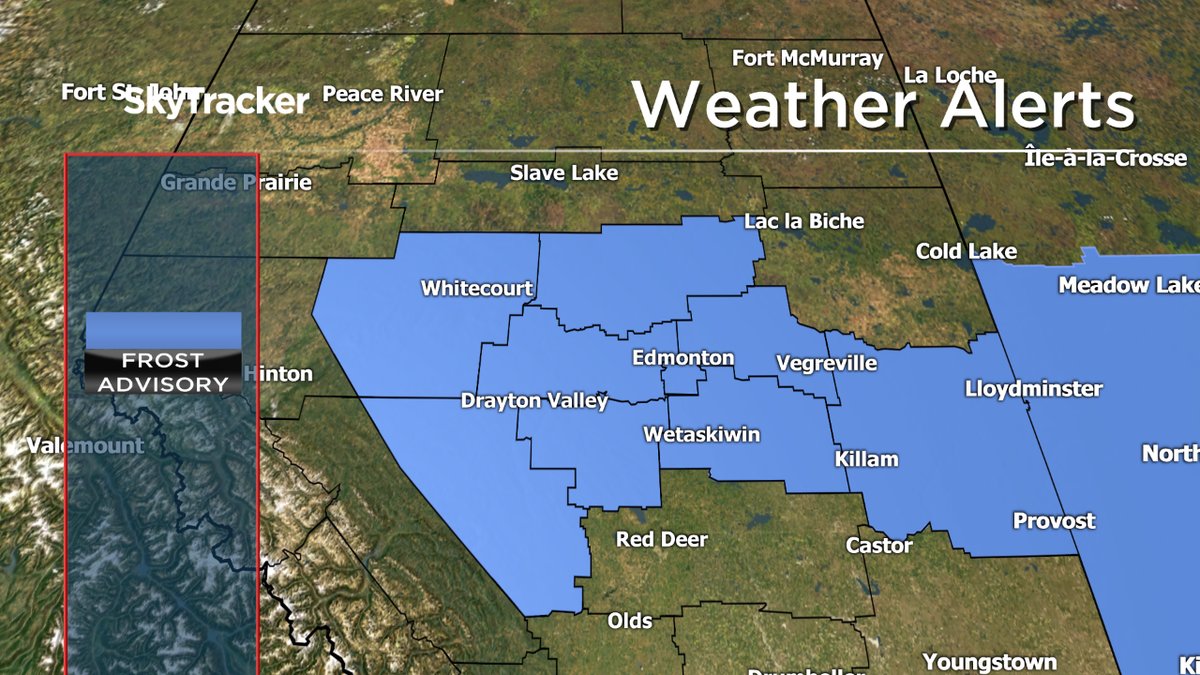 Frost advisories were issued by Environment Canada Tuesday afternoon and cover much of central and east central Alberta. Those advisories are issued for communities expected to experience early season frost that could damage crops and gardens.