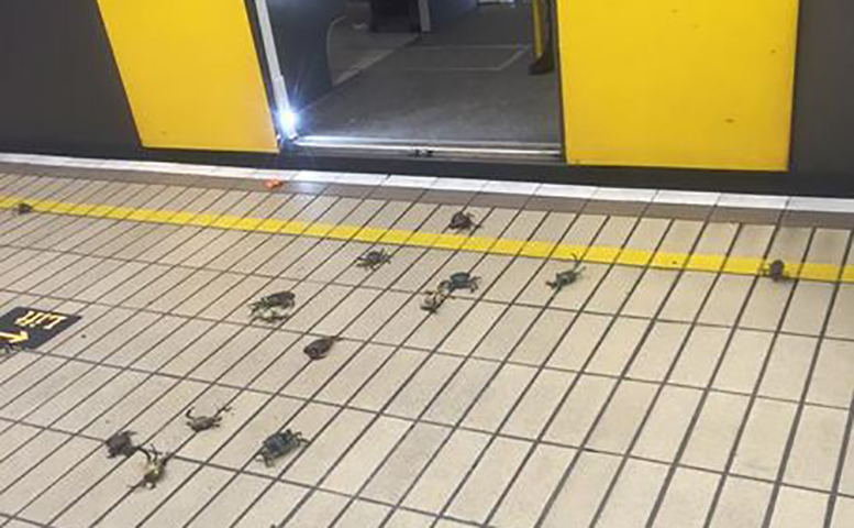 Andrew Desborough, who works close by, was on the subway platform when he saw them: Fist-sized grey-blue crabs scuttling to get away or flipped over onto their backs.